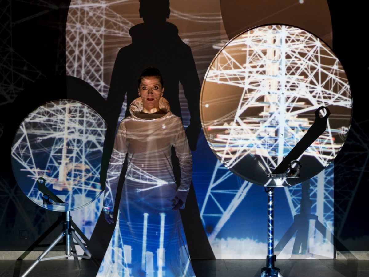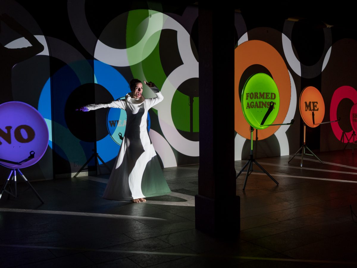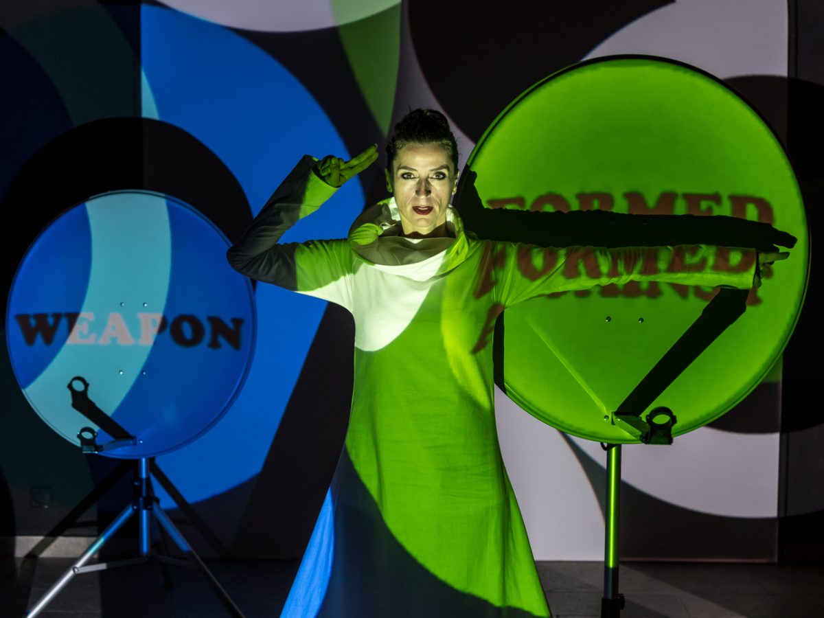The video-music-performance ‘No Weapon Formed Against Me Shall Prosper’ premiered in 2016 at the UNPAINTED ART FAIR in Munich. For the opening of Manuela Hartel’s exhibition at the Kunsthaus Zofingen, Switzerland, she unveiled her video installation with an adaption of this performance. The video image, projected onto satellite dishes and performers, condenses the setting into a multi-layered total work of art with organically produced, electronically processed sound that she interprets with her voice.